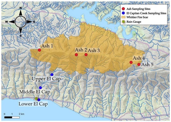 Whittier Fire and sampling locations. The Whittier Fire scar is represented by the orange shaded region []. Ash 1 was sampled at 34°31′57.0″ N, 120°01′17.0″ W; Ash 2 at 34°31′32.9″ N, 119°58′04.8″ W; Ash 3 at 34°31′33.2″ N, 119°57′14.4″ W; Ash 4 at 34°30′53.3″ N, 119°53′19.7″ W; and Ash 5 at 34°30′42.1″ N, 119°52′39.0″ W. Upper El Cap is located at 34°29′49.2″ N, 120°00′11.9″ W, ~0.7 km downstream from the fire perimeter, with a subcatchment area of 8 km2. Middle El Cap is located at 34°28′41.2″ N, 120°01′12.0″ W, ~3 km downstream from the fire perimeter, with a subcatchment area of 14 km2. Lower El Cap is located at 34°27′38.5″ N, 120°01′20.3″ W, ~5 km downstream from the fire, with a subcatchment area of 16 km2. Fire perimeter data from []. The base map for Figure 1 was obtained from the OpenStreetMap Foundation (www.openstreetmap.org (accessed on 10 February 2021)). The stream data was obtained from the National Hydrology Dataset (NHD) [].