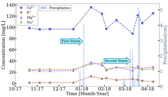 Major cation concentrations at Upper El Cap (East Fork) site and precipitation data. Precipitation data are expressed as cumulative precipitation each day. Precipitation events clustered into two major storms, referred to as the first major storm (inclusive of 6 January 2018) and the second major storm (inclusive of 10 March 2018) of the season [].