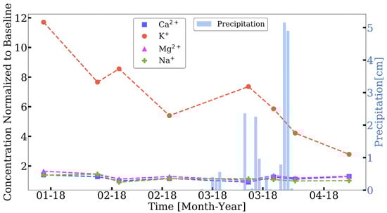 To better quantify storm-induced changes in major cation concentrations, the values were normalized to the pre-storm baselines []. At the Upper El Cap site, K+ concentrations increased by more than one order of magnitude, and remained above baseline from 13 January 2018 through the end of the study; K+ concentrations were 6–7 times that of the pre-storm concentration ~1 month following the first storm, decreasing to 2.8 times that of the pre-storm value on the final sampling date ~3 months later (Figure 4).