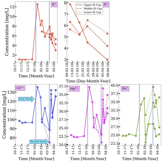 In the period following the first major storm, major cation concentrations at the Middle and Lower El Cap sites were elevated compared to baseline values at the Upper El Cap site, with the exception of Ca2+ and Mg2+ at the Lower El Cap site just prior to the second storm. Compared to the first storm, the second major storm had a smaller effect on major cation concentrations at the Upper El Cap site (Figure 4) [].
