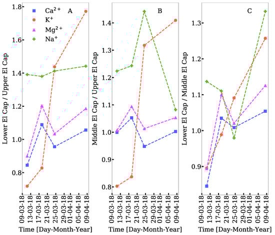 Comparison of major cation concentrations between downstream and upstream sites for dates (day-month-year) following the second storm (11 March 2018). Each plot illustrates same-day downstream/upstream concentration ratios for a pair of sites. The results show how concentrations of major cations changed proportionally over time (y-value > 1 implies higher concentrations downstream; <1 implies lower concentrations downstream; =1 implies no change). (A) Concentrations in the Lower El Cap site compared to those of the Upper El Cap site; (B) concentrations in the Middle El Cap Site compared to those of the Upper El Cap site; and (C) concentrations in the Lower El Cap site compared to those of the Middle El Cap site. Dates follow the second major storm of the season.