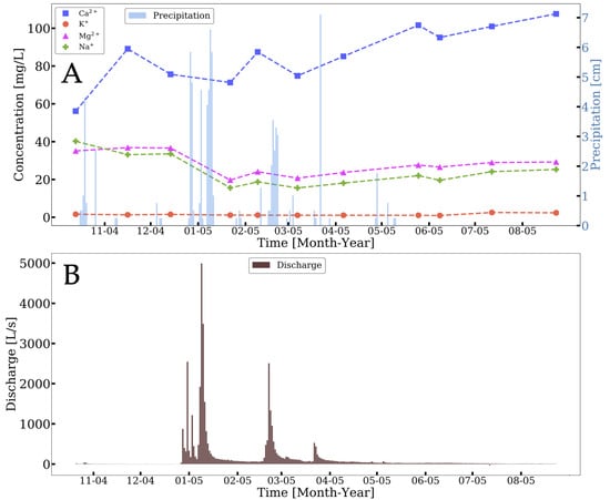 Rattlesnake Creek (unburned comparison site) in 2004–2005: (A) major cation concentrations compared with local precipitation []; (B) daily average discharge from Rattlesnake Creek [].