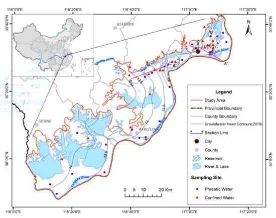 The Yangtze River is the largest river in China and the third-largest river in the world. It plays an important role in the sustainable development of the regional economy and ecology [,]. To strengthen the protection and restoration of the ecological environment in the Yangtze River basin, facilitate the effective and rational use of resources, safeguard ecological security, ensure harmony between humans and nature, and achieve the sustainable development of the Chinese nation, the 24th Standing Committee session of the 13th National People’s Congress passed the first river basin law “Yangtze River Protection Law” on 26 December 2020, and this law came into effect on 1 March 2021. Anqing is located beside the Yangtze River on the alluvial plain in the lower reaches. It is an important city in the Yangtze River Economic Belt and the Yangtze River Delta. Since the 1980s, many large-scale chemical plants have been built in Anqing, posing a serious risk of water pollution [,,]. Therefore, the study of the interaction between surface water and groundwater in Anqing is of great practical significance to the prevention and control of water pollution and the restoration of the ecological environment in the Yangtze River.