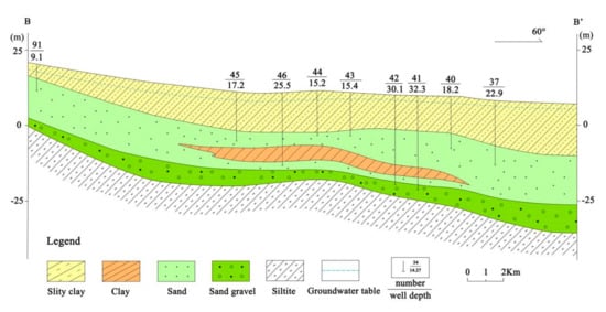 Quaternary aquifers in the study area are mainly Holocene sand and gravel phreatic aquifers and lower Pleistocene gravel confined aquifers, with thicknesses of 7–50 m and 0–24 m, respectively. There is no continuous aquitard between the aquifers, but some areas have relative aquitards, as shown in Figure 2 and Figure 3.