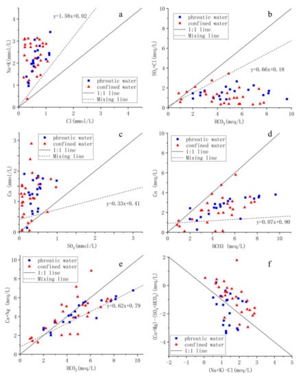 In the process of groundwater circulation, the regularity of each ion component and some ion ratios will change. Therefore, the characteristics of ionic combinations and related ion ratios in groundwater can be used to assess the genesis of groundwater, and identify the source of the chemical components of groundwater and mixing process of different water bodies; this is an effective approach for analyzing the evolution of groundwater [,,]. However, the variation of ion concentration is largely affected by mixing. When the ion composition is near the mixing line, it indicates that there is no water–rock interaction. When the ion composition deviates from the mixing line, it indicates that it is affected by water–rock interaction. The millimolar per liter (mmol/L) ratio between (Na++K+) and Cl− (γ(Na+K)/γCl can reflect the source of Na+ and K+. A γ(Na+K)/γCl close to 1 indicates the dissolution of halite; a γ(Na+K)/γCl ratio greater than 1 indicates the dissolution of silicates or cation exchange. The main sources of Ca2+ and Mg2+ in groundwater are mainly the dissolution of carbonates or silicates and evaporites. Accordingly, the mmol/L ratio between Ca2+ and SO42−(γCa2+/γSO42−, milliequivalents per liter (meq/L) ratios between Ca2+ and HCO3−(γCa2+/γHCO3−) and Ca2+ + Mg2+ and HCO3−(γ(Ca2++Mg2+)/γHCO3−) can be used to determine the main sources of Ca2+ and Mg2+. A γCa2+/γSO42− ratio close to 1, corresponds to gypsum dissolution. A γCa2+/γHCO3− ratio close to 1, corresponds to calcite dissolution. A γ(Ca2++Mg2+)/γHCO3− close to 1, corresponds to dolomite dissolution. The meq/L ratio of (SO42−+Cl−) to HCO3−(γ(SO42−+Cl−)/γHCO3−) reflects the main source of chemical components in groundwater. A γ(SO42−+Cl−)/γHCO3− ratio greater than 1 indicates evaporite dissolution as the main contributor to the chemical composition of groundwater. A γ(SO42−+Cl−)/γHCO3− ratio less than 1 indicates carbonate dissolution as the main contributor to the chemical composition of groundwater. The ratio of γ(Na++K+-Cl−)/γ(Ca2++Mg2+-HCO3−-SO42−) can be used to reflect cation exchange. In the presence of cation exchange, γ(Na++K+-Cl−) will be negatively correlated to γ(Ca2++Mg2+-HCO3−-SO42−) with a slope of −1, that is, the content of Ca2++Mg2+ decreases with increasing Na++K+ content [,,].