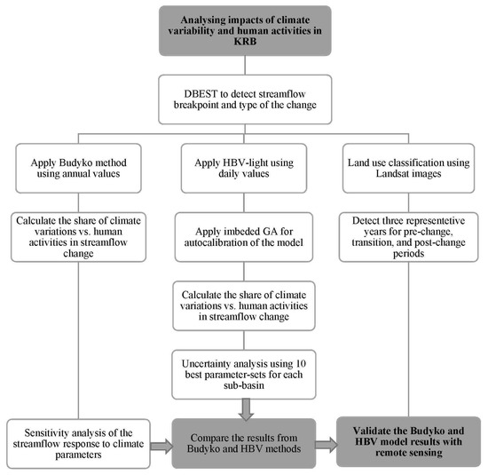 In view of the above, this study introduces a novel framework that combines mathematical, hydrological, and remote sensing methods to separate the contribution of climate variation and regional human activities (such as land use/land cover change) to streamflow changes of large data-scarce river basins and verifies the results using an independent approach. For this purpose, we used hydrological data of the KRB as a relevant case study to validate the implemented framework. We applied the Budyko method and hydrological model (HBV model) to analyze mean annual streamflow variations of the studied region during the last three decades (from 1980 to 2012) and quantify the impact of climate variation vs. regional human impacts. To detect the breakpoints in the observed streamflow and climate variables (i.e., precipitation and evapotranspiration), the newly developed Detecting Breakpoints and Estimating Segments in Trend (DBEST) algorithm [18] was employed, which provides useful information on the number, significance, and type of changes observed. The DBEST algorithm provides insights of the length of non-abrupt changes and underlying reasons. Applying the DBEST algorithm in hydrological studies, offers a systematic improvement for segmenting streamflow time-series before implementing the hydrological modeling and Budyko method. To validate the proposed models’ results and the DBEST detected breakpoint/s, remote sensing was employed and multiple land use maps of the basin area over the studied period were provided.