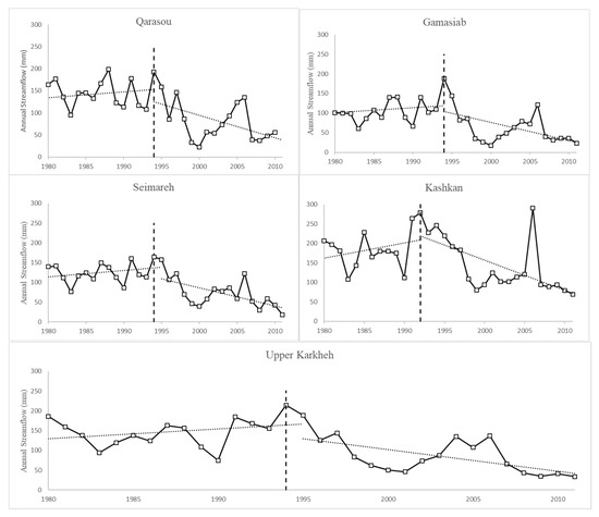The DBEST analysis for potential evapotranspiration showed an increasing trend without detecting any significant breakpoint, while precipitation analysis showed two major breakpoints (1994 and 2006) in most sub-basins. As shown in Table 4, the major precipitation and streamflow breakpoints coincide for all sub-basins except for the Kashkan. In this particular sub-basin, the DBEST detected no significant breakpoint for precipitation but did detect an insignificant abrupt change in 1990, prior to the year that the streamflow breakpoint took place. In 2006, the Gamasiab, Seimareh, and Qarasou experienced substantial decreases in precipitation. While the streamflow trends were found to respond to this change, it did not significantly affect the already decreasing streamflow trends.