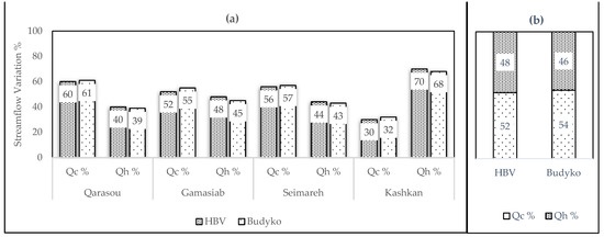 Figure 4a,b, provides a visual comparison between the implemented methods. Results for the Seimareh sub-basin are the cumulative response of the two upper sub-basins, Qarasou and Gamasiab, and the Seimareh. These findings indicate that both climate variation and human activities have a strong influence on streamflow changes in the sub-basins. However, the impact of climate variation on the stream flow changes is observed to be relatively more substantial than that of human activities in all sub-basins, except in the Kashkan.
