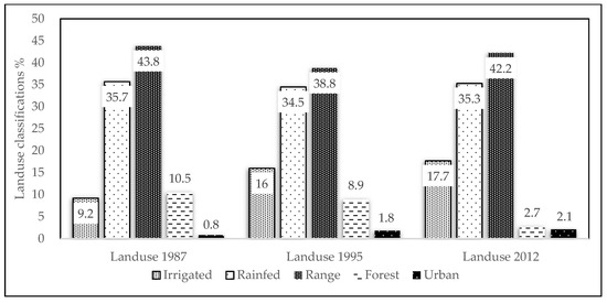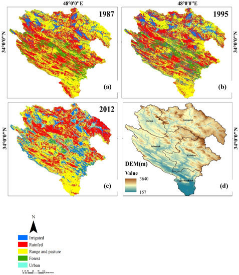 Land cover change during the study period was investigated using Landsat 5 TM, as it is the only satellite mission that provides images dating back to the 1980s. The three years of 1987, 1995, and 2012 were selected to present the land use condition of the KRB, representing the three phases of the pre-change, transition, and post-change periods, respectively. Five types of land use were detected in the study area encompassing (i) irrigated (merged with about 5–10% rangelands and pasture area), (ii) rainfed (merged with about 10–20% irrigated and rangeland and pasture area), (iii) range and pasture, (iv) forest (merged with about 10–20% rangeland and pasture area), and (v) urban (includes buildings and orchards).