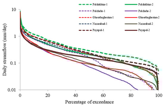 Most climate studies in the region have investigated the future hydrological response of the KRB basin under different climate scenarios (e.g., [49,50]). A handful of studies investigated water availability in the basin [2,30] and identified a significant decrease in the streamflow of the KRB during recent decades. For illustrating streamflow changes, flow duration curves (FDCs) and mean monthly flow for the pre- and post-change periods are provided in Figure 7 and Figure 8. Most climate studies in the region have investigated the future hydrological response of the KRB basin under different climate scenarios (e.g., [49,50]). A handful of studies investigated water availability in the basin [2,30] and stated significant decrease in streamflow of KRB during recent decades. For illustrating streamflow changes, Flow Duration Curves (FDCs) and mean monthly flow for the pre- and post-change periods are provided in Figure 7 and Figure 8.