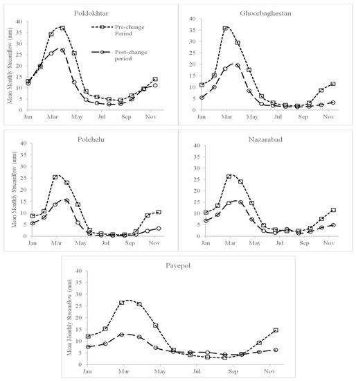 The detected breakpoint divides the streamflow time-series into a pre- and post-change period. In the pre-change period, also called the natural period, it is assumed that humans’ impacts on streamflow is not considerable. For the period after the breakpoint, the post-change period, both climate variation and human activities are considered to affect the streamflow [14,15,27,28,29].
