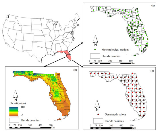 This figure shows the locations of the stations obtained from Florida Climate Center (a), the elevation distributions (b) and generated stations at the centroid of each grid (c) over Florida.
