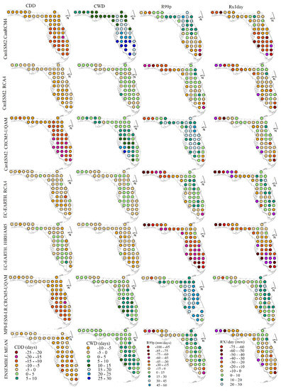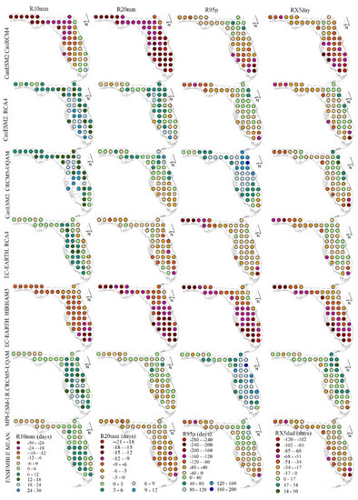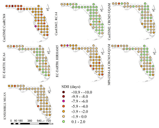 Figure 2, Figure 3 and Figure 4 show the absolute biases (model minus observation) in the climatological mean of the precipitation indices (i.e., CCD, CWD, R99p, Rx1day, R10mm, R20mm, R95p, Rx5day and SDII). Figure 2 shows the pattern of the absolute biases of some of precipitation-based climatic indices that include CDD, CWD, R99p and RX1day generated at the stations located at the center of each pixel across Florida. The observed precipitation and temperature-based climatic indices are show in Appendix A. In general, all the RCMs except EC-EARTH.HIRHAM5 overestimated the consecutive dry days (CDD; rainfall < 1 mm) since negative absolute bias values were indicated in the majority of the stations. Although the ensemble mean underestimated CDD in majority of the stations with the absolute biases of +/−5 range, it still showed good skill than some of the RCMs (e.g., CanESM2.CanRCM4, CanESM2.CRCM5-UQAM and MPI-ESM-LR.CRCM5-UQAM). Since the ensemble mean was generated using the simple arithmetic mean of the climatology of the individual ensemble member, it outperformed some of the RCMs and underperformed as compared to some of the RCMs. EC-EARTH.HIRHAM5 estimated CDD very well as compared to the other climate models with relatively minimum absolute bias of +/−5 range in 85% of the stations. EC-EARTH.RCA4 also showed good performance next to EC-EARTH.HIRHAM5 in 77% of the stations under similar CDD criteria. CDD is an effective index to indicate the dry spell or drought condition and hence there is no dry biases of the RCMs in the majority of the stations. Except EC-EARTH.HIRHAM5, most of the RCMs overestimated CWD in majority of the stations. EC-EARTH.RCA4 and CanESM2.RCA4 showed relatively better skill in explaining CWD as compared to other climate models with absolute biases ranging between −5 to 5 in 100% and 98% of the stations respectively. CanESM2.CanRCM4 overestimated CWD mainly in the southern part. Next to EC-EARTH.RCA4 and CanESM2.RCA4, MPI-ESM-LR.CRCM5-UQAM RCM and EC-EARTH.HIRHAM5 also performed very well in estimating CWD except an overestimation in 31% of the stations and underestimation in 25% of the stations, respectively. Despite some discrepancy in the skill of the EC-EARTH.HIRHAM5, EC-EARTH.RCA4 and CanESM2.RCA4 RCMs in reproducing the observed CWD in some stations, these three RCMs showed relatively better skill in explaining CDD and CWD as compared to the other RCMs. Errors in the parameterizations of the regional climate model in simulating the convective systems at the local scale often introduce systemic dry and wet biases. The wet bias (less CDD and high CWD) in most of the climate models indicates more frequent occurrence of 1 mm and above daily precipitation as compared to the observation. The climate models have been portrayed in the past by the issue of estimating more frequent precipitation events and this problem has not been significantly improved in the RCMs used in this study [51]. The ensemble mean CanESM2.RCA4 and EC-EARTH.RCA4 relatively showed a better skill as compared to the other RCMs in estimating the extreme wet days (R99p) with the absolute biases ranging between −15 to 15 in 65%, 56% and 52% of the stations, respectively. CanESM2.CanRCM4 also showed a good skill in estimating R99p in 40% of the stations, while the remaining RCMs underperformed in reproducing R99p. CanESM2.CRCM5-UQAM relatively outperformed other RCMs in estimating the maximum 1 day precipitation (Rx1day) in 67% of the stations located in different parts and followed by MPI-ESM-LR.CRCM5-UQAM (58% of the stations) compared with absolute biases +/−10 range. The ensemble mean CanESM2.RCA4 and EC-EARTH.RCA4 closely performed in estimating Rx1day in 50, 48 and 46% of the stations while the other RCMs underperformed in the majority of the stations (absolute biases ranging from −10 to 10). This result highlights relatively less performance of RCMs to fully capture the extreme precipitation events as compared to capturing less extreme events attributed to the coarser spatial resolutions of the RCMs and the high dynamics of the extreme precipitation events primarily at mesoscale, which can be difficult to fully capture using relatively coarse resolution RCMs. Diaconescu et al. [25] reported improvement in the RCMs performance in characterizing some precipitation based climatic indices during summer owing to improvement in spatial resolutions of some of the RCMs. Lower score in simulating some of the precipitation extremes (e.g., RX1day) was also reported even though finer spatial resolutions of some of the RCMs (e.g., CRCM5 and CanRCM4). The occurrence of wet and dry day events can be better reproduced through conducting a detailed analysis of the convective rainfall for some of the RCMs (e.g., CanRCM4).