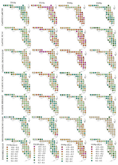 The absolute biases estimated using the difference between model climatology and observed climatology for TN10p (first panel), TX10p (second panel), TN90p (third panel) and TX90p (fourth panel) temperature indices at the stations generated at the centroid of each grid across Florida.