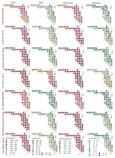 All the climate models underestimated the number of days where the daily maximum temperature is greater than 25 °C (SU25) as shown in Figure 7 (first panel). Relatively better performance has been observed in the stations located in Northwest by the majority of the RCMs. In addition, CanESM2.CanRCM4 and EC-EARTH.HIRHAM5 relatively indicated minimum absolute biases in the southern part. The ENSEMBLE MEAN outperformed the other RCMs except CabESM2.RCA4 in reproducing the tropical nights (TR20) even though the other RCMs also showed good performance in some of the stations. Except EC-EARTH.RCA4, the rest of the RCMs overestimated the tropical nighttime temperature in majority of the stations. Except the good performance of CanESM2.CanRCM4 in few stations in northwest part, the rest of the RCMs underestimated the maximum mean temperature (TMAXmean) as shown in Figure 7 (third panel). In overall, most of the RCMs reproduced the minimum mean temperature over 21% of the stations and EC-EARTH.RCA4 performed well in 56% of the stations as compared to the other RCMs in +/−1 range. Temperature based indices that are strongly connected to the freezing and heat stress events have prominent influence on the agricultural crop production. Application of the regional climate models for agricultural management needs to apply biases correction and to quantify the uncertainty of the RCMs since crop production is very sensitive to the freezing and heat stress events in Florida.