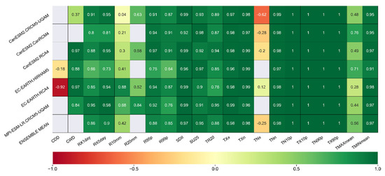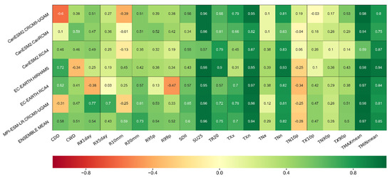 The heatmap plot of the pattern correlation coefficient of the climatic indices derived from the observed and climate-model-based temperature and precipitation. The number in each cell shows the numeric value of the pattern correlation coefficient.