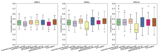 The correlation coefficient values of the climate-model-based SPEI and the observed SPEI for 3- (left), 6- (middle) and 12-month aggregates (right).