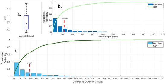 Figure 2a). The 22 recorded seasons had, on average 21.5 rain events per season, where a rain event is defined as rainfall of at least 1 mm with 24 h of preceding dry weather. The average rain event in the recorded dataset had 23.5 mm falling in 32.5 h. The average dry period between consecutive rain events (excluding the long dry summer) lasted 160 h, or 6.67 days (