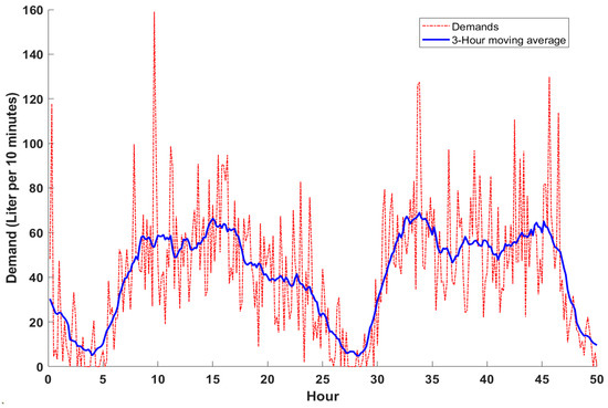 Figure 3. Although the demands for each 10-min timestep are erratic (as would be the case in a real building), smoothing the raw data with a 3-h moving average reveals a typical residential diurnal pattern of toilet flushing [