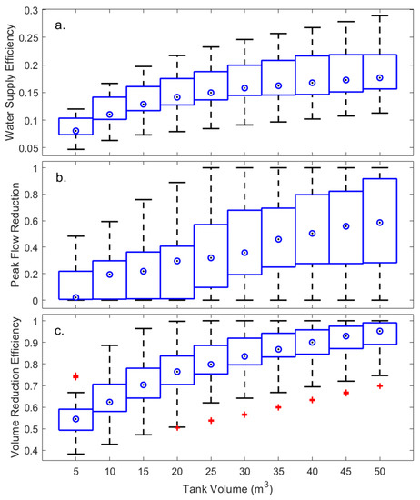 3 tanks can collect 95% (median value, 25–75 percentiles from 89% to 99%) of the annual rainfall, and all tank sizes larger than 25 m