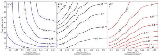 2 and an apartment number of 30–60 were modelled under similar 100 rain-season simulation, resulting in 100 PFR, WSE and VRE results per building. Contour plots of the mean values of the estimators were charted as a function of storage tank volume and the normalized roof area (roof area (m