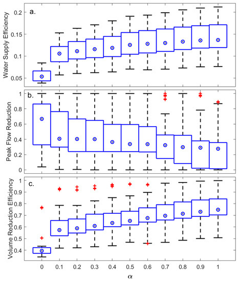 Figure 6a). Slightly increasing α to 0.1 (water is released from the tank until storage is 10% of the full tank capacity) more than doubled the supply efficiency to 11% (median value). For an α between 0.1 and 1, the median values of WSE increase linearly with α, peaking at 14% of demands when α = 1; no water is released prior to rain events.