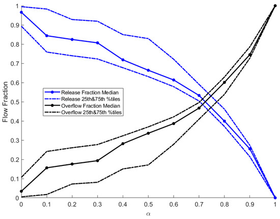 Figure 7) was observed at α values of 0.7–0.8, where the median values of VRE, PRF and WSE were 0.7, 0.3, and 0.13, respectively. When α = 1 the VRE, PFR and WSE medians were 0.75, 0.28 and 0.14 respectively. When α is reduced to 0.5, 65% of the total water losses are through controlled release, while 35% is through overflow (median values), and the median values of WSE, PFR and VRE are 0.13, 0.34 and 0.65, respectively.