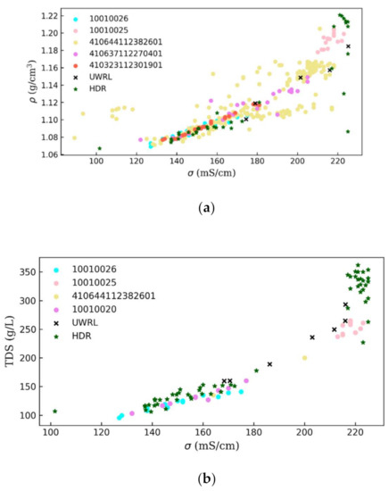 where TDS is in g/mL and ρ is in g/L at 20 °C. Therefore, to directly compare ρ collected from this study (identified in Figure 7 as UWRL data) to USGS data the same technique was adopted. Naftz et al. [42] developed an equation of state for the hypersaline water from the southern part of GSL, where ρ can be computed as a function of temperature and salnity. The Naftz et al.’s equation of state was not useful for the current study due to lack of a relationship between specific conductance and salinity, and also the fact that the aforementioned equation was developed only using data from the south part of GSL. Note that since 2016, a private consultancy HDR was also monitoring ρ at the new breach on behalf of the Union Pacific Railroad and they also adopted the USGS approach; these three data sets are presented in Figure 7.