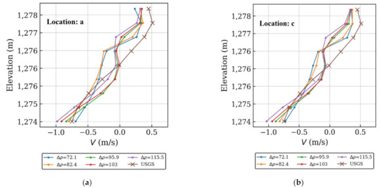 The second source of uncertainty was the exact location of the ADVM uplooker with respect to the central column of piers at the WC breach. It is known that the uplooker is located slightly north of the northern-most pier in the center column, and within 1.5–2.5 m east of the that pier. However, to ascertain the potential location of the uplooker, the streamwise velocity was probed at multiple locations east of the pier (Figure 4) and the locations were investigated using different density differences (Figure 9). The results show that the correct density difference, Δρ, between the northern and southern sides is ~82.4 kg/m3, and the location of the uplooker is about 1.5 m east of the pier. Given the uncertainty in the field data and its location, the comparison between the measured and computed velocity (V) profiles is satisfactory (Figure 10). The only points in the profile that do not compare well, which have more than 50 percent error, are V at the interface of the north–south and south–north flows. This is not unexpected, as there is some uncertainty in the field velocity profile at this interface and this section is more challenging to simulate numerically as there is a sudden change in density and velocity.