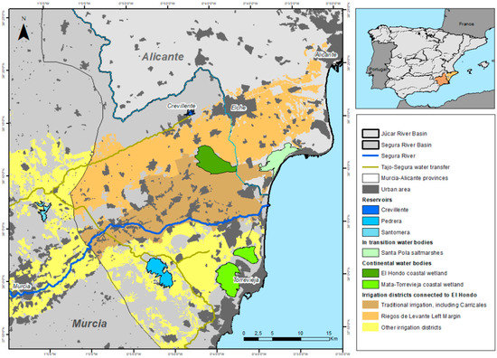 Location of El Hondo and Santa Pola CWs and the area irrigated by Riegos de Levante and Carrizales irrigation communities. Source: adapted from [56].