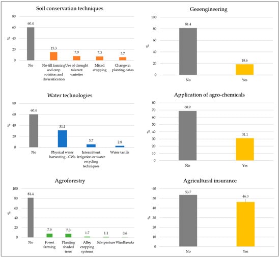 Most farmers (74.6%) agree on the need for adaptation to climate change, but only the use of treated wastewater was positively considered (68.4%) as an adaptation measure. Overall, one-third of the respondents (36.2%) intended to change soil conservation techniques, mainly focused on no-till farming and crop rotation and diversification (15.3%) (Figure 2). Investing in water technologies is considered an option for about 40% of the respondents, being physical water harvesting (CWs) the favorite option (31.1%). Although less than 1 of 5 respondents promoted agroforestry practices, forest farming and planting shaded trees were positively considered (7.9% and 7.3%, respectively). Additional adaptive options, such as geoengineering or the application of agrochemicals, were discarded by about 70–80% of the respondents. Otherwise, agricultural insurance was considered for less than half of the farmers. Regarding main adaptation measures, soil conservation techniques and treated wastewater use are the preferred options for the respondents, while geoengineering is on the opposite side. However, the reliability and spread of data distribution highlighted significant dispersion among the set of values, especially regarding soil conservation techniques and agroforestry practices (Table 7).