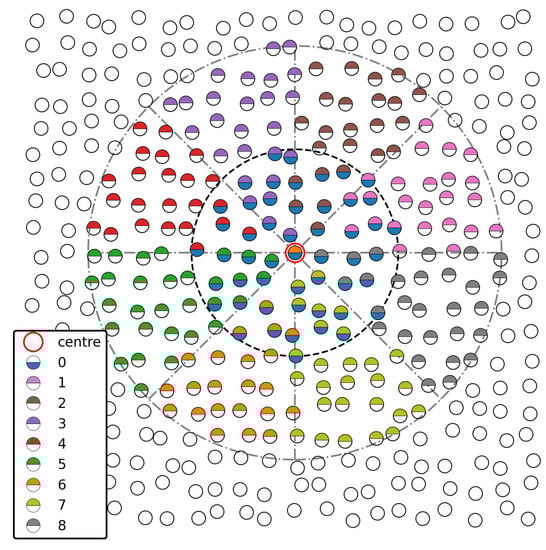 For each i-th particle, several candidate stencils for the reconstruction are initially considered, each of them composed by a subset of the particles in the neighbourhood. Figure 1 shows a sketch of the candidate stencils for a sample randomized 2D particle distribution. The so-called central stencil is composed by all the particles at distance lower or equal to the length of the kernel support. On the other hand, there are several lateral one-sided stencils, all of them composed by particles at distance lower or equal to the double of the length of the kernel support. In 2D, there are 8 lateral one-sided stencils: a neighbouring j-th particle belongs to the s stencil () when the polar coordinate of the vector fulfils the expression: