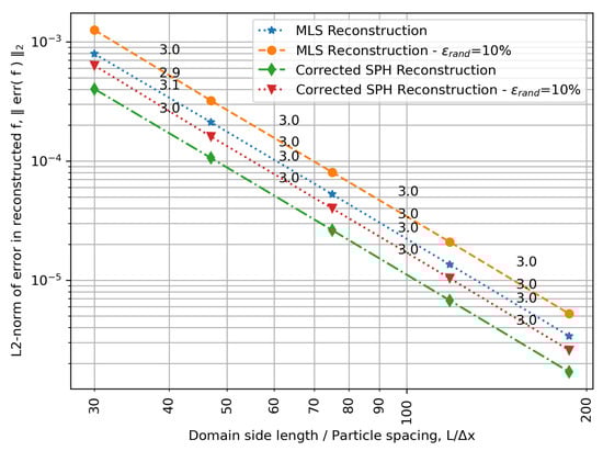 Figure 2 shows the convergence of the L2 norm of the error in the reconstruction of Equation (20) for the MLS and for the corrected SPH interpolation methods (annotations of the order of convergence are also included). The MLS reconstructions have been computed via a Singular Value Decomposition (SVD) algorithm (see, e.g., chapter 15 in [] for details). Both above-mentioned uniform and randomized particle distributions have been used. A third order convergence rate is achieved as one would expect from the second order approximation of (21). However, in both particle arrangements, the accuracy of the reconstruction when using corrected SPH interpolations is higher for a given resolution.