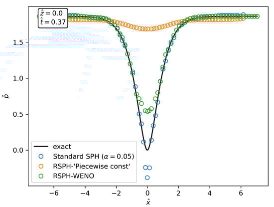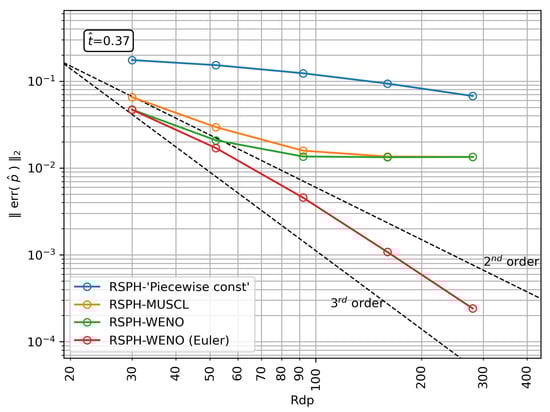 - RSPH with WENO reconstruction: The high-order spatial reconstruction further improves the accuracy of the trajectories described by the particles which, in conjunction with the usage of standard divergence SPH operators in Equations (5) and (6), ruins the beneficial effect of the high-order reconstruction.