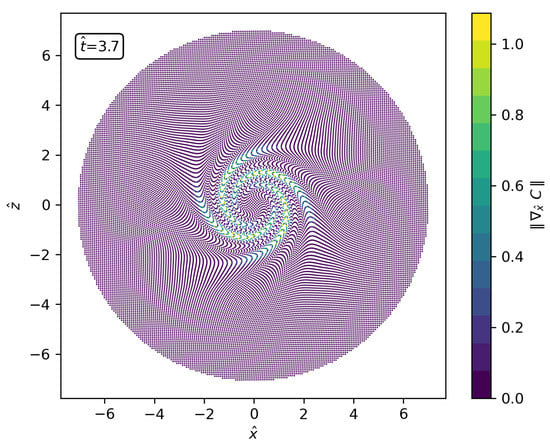 In this plot, the resolution is . The high-order spatial reconstruction makes the particles move accurately along their Lagrangian trajectories which in its turn leads to anisotropic particle distributions. An immediate consequence is the (local) increase of the gradient of partition of unity which translates into low accuracy of the standard SPH approximations of divergence operators used in Equations (5) and (6).