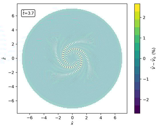 computed by the RSPH-WENO scheme. In this plot, the resolution is . It may be seen that the algorithm keeps volume variations small, below a 3% (in absolute value).