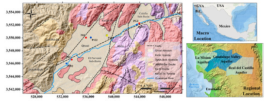 From a geological perspective, in GV, several tectonic processes originated two sub-basins: Calafia and El Porvenir (Figure 1). These are aligned to a NE–SW direction and eventually were filled with unconsolidated material from erosion, transport, and sedimentation processes. Intrusive and extrusive igneous rocks delimit the valley and constitute the hydraulic basement of the aquifer. Granodiorite, Tonalite, and Granite rocks from the Upper Cretaceous dominate in the north, east, and south regions. Meanwhile, Riodacite and Andesite rocks from the Upper Jurassic prevail in the west zone. Quaternary unconsolidated alluvial deposits constitute the Guadalupe Valley Aquifer (GVA) [3].