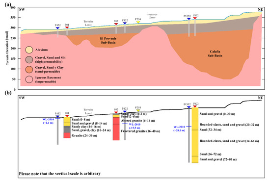 In a hydrogeological setting, the GVA is considered as a heterogeneous, unconfined aquifer formation made of three principal hydrogeological units of variable thickness: (i) highly permeable unit (alluvium, gravel, sand, and silt); (ii) semi-permeable unit (gravel, sand, and clay); and (iii) low permeability unit (igneous basement). These hydrogeological units are present in both sub-basins and constitute the main groundwater reservoir in the GVA (Figure 2a). The El Porvenir sub-basin (EPSB) prevails in the southern region of the GV and varies in depth from 70 to 100 m. The Calafia sub-basin (CSB) dominates the northeastern zone of the GV, and its depth varies from 300 to 350 m. The aquifer recharge is based on two dominant processes: (i) horizontal recharge, as a result of superficial and subterranean Guadalupe River flows; and (ii) vertical recharge, associated to percolation of precipitation and agricultural-irrigation excess [2,4,5,6].