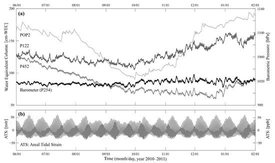 Strictly speaking, the fluid contained in the porous medium responds to a three-dimensional strain tensor (εv). Nevertheless, considering the induced deformation associated with SET and tectonic activity, the εv is not well-known as a priori [17,20]. Moreover, the εzz value measured on the terrain surface is approximately equal to the value of a horizontal strain component but with an opposite sign [20]. Therefore, it is more appropriate to analyze the WL response to an areal tidal strain (εA) defined by Rojstaczer and Agnew [13] and calculated as follows: