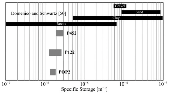 Comparison between the estimated specific storage values (P452, P122, and POP2) and the expected values as a function of the rock-material type.
