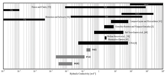 Transmissivity values were calculated based on estimations of ηk, the order of magnitude of SC, and Figure 2 from Hsieh et al. [34]. The estimated T-values were ranging from 6.67 × 10−7 to 1.29 × 10−4 m2∙s−1 (Table 4). The lowest T-value was calculated for well P122, and the highest T-value in well P452, both wells are in the EPSB. Estimated T-values are comparable with those (3.40 × 10−4 to 52.40 × 10−3 m2∙s−1) determined by Andrade-Borbolla [1], and to those (4.00 × 10−5 a 60.00 × 10−3 m2∙s−1) calculated by CNA [4]. Finally, hydraulic conductivity values were calculated from estimations of T and B. The estimated K-values ranged between 2.30 × 10−3 to 2.97 × 10−1 m∙d−1 (Table 4). The highest K-value was calculated for well P452 located at the SW of EPSB; a similar hydraulic behavior was described by Campos-Gaytán and Kretzschmar [41]. The lowest K-value was calculated for well POP2 located on the CSB. In general, the estimated K-values were up to two or four orders of magnitude lower in comparison (Figure 6) to those determined from water-table elevation modeling [3,38,41,43]. In contrast, the estimated K-values are comparable with those reported in the classic hydrogeological literature [50,53]. Moreover, the estimated K-values are pretty similar to those determined from the soil grain-size analysis by Del Toro-Guerrero et al. [40] and with those calculated from pumping tests in wells of the GVA by CNA [4].