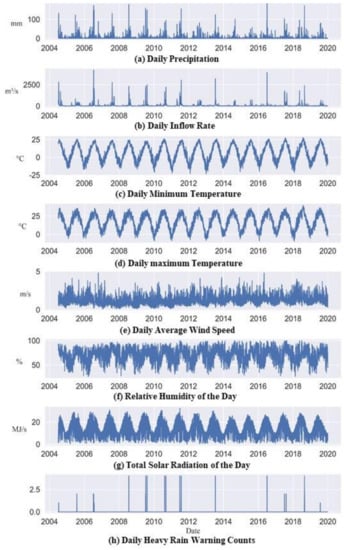 Daily weather and daily dam data for this experiment were obtained from the Korea Water Resources Corporation [] and the Korea Meteorological Administration [], respectively. The data ranged from 4 July 2004 to 31 December 2019.