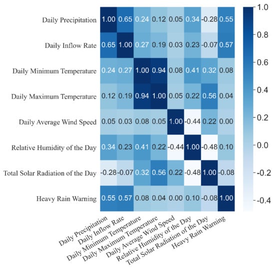 Figure 2 shows a heatmap of the correlation coefficients between the input variables. In addition to the daily minimum and maximum temperature correlation, there is a high correlation between the inflow rate, precipitation, and heavy rain warnings. Moreover, the heatmap suggests that the daily minimum and maximum temperatures, humidity, and total solar radiation have a high correlation.