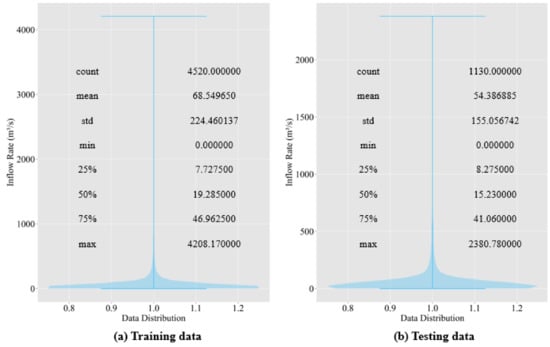 Figure 3 suggests that both the training and the testing data are left-skewed. The third interquartile for both training and testing data are less than 50 m3/s, and the maximum value is greater than 2300 m3/s. The noticeable difference between the third interquartile and the maximum value suggests that the Soyang River Dam deals with occasional heavy floods.