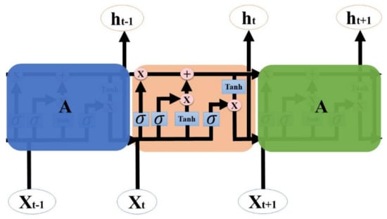 RNNs suffer from a vanishing gradient problem as the length of the sequence increases. To overcome this problem, LSTM uses gated functions to accept long sequences and decide which part of the input data to remember []. The structure of LSTM is shown in Figure 4. Equations (1)–(6) are equations for the LSTM [], where Ot, ct, ht, and ft represent the input, output, cell state, hidden state, and forget state, respectively; t represents the time step, and xt is the input vector for LSTM. Wn, Wf, and Wi represent the weight of the output gate activation vector, forget gate activation vector, and input gate activation vector, respectively; σ is the activation function for the forgotten, hidden, and cell state gates. Nt uses the tanh activation function to update the weight of the input. Some researchers have used the LSTM to predict the inflow rate [,].