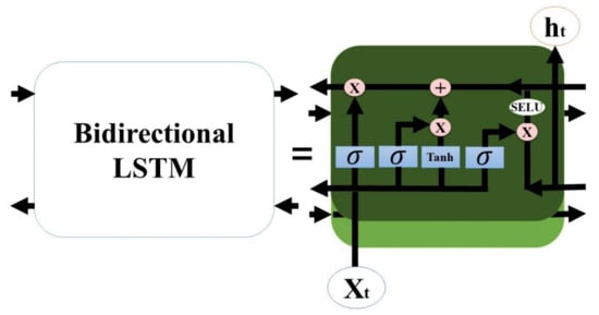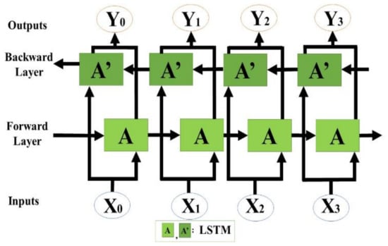 As shown in Figure 5, LSTM can be trained in both directions. Bidirectional LSTM combines a bidirectional RNN and LSTM []. A unidirectional LSTM processes data in the order of input and tends to predict based on recent patterns. In contrast, the bidirectional LSTM learns from both past to present and present to past data, providing a higher predictive performance than the unidirectional LSTM [,].