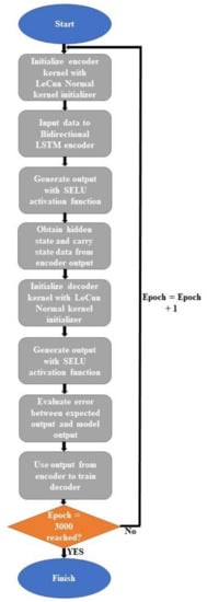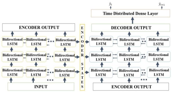 Suyskever et al. [] introduced a Seq2Seq model consisting of an encoder and a decoder. The encoder compresses the input sequence data, and the decoder creates a sequence output based on the compressed data. The encoder uses an input sequence and outputs the hidden state vectors and resultant vectors to the decoder. The decoder then uses outputs from the encoder to train on the difference between the real and predicted values.
