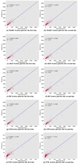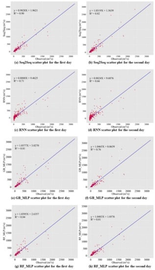 Figure 11 and Figure 12 suggest that our model is a good fit. Nearly all the data are close to the 45-degree line. Our model has the best performance for predicting the first day. RNN was the worst-performing model among the nine models. Scatter plots show that GB_MLP, RF_MLP, RNN, Seq2Seq shows the nearly equal predictive performance when the inflow rate is less than 1000 m3/s. RNN tends to underestimate when the inflow rate is greater than 1000 m3/s. GB_MLP, RF_MLP, and Seq2Seq tend to show similar predictive performance, but Seq2Seq tends to outperform other models when the inflow rate is greater than 1500 m3/s.
