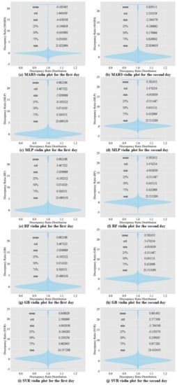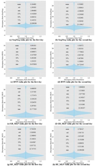 To evaluate the performance of the Seq2Seq model, we analyzed the discrepancy ratio. We analyzed with a test dataset. Equation (14) shows how to calculate the ratio. represents the predicted value, while represents the observed value. If the ratio is greater than 1, the model is overestimating. If the ratio is less than 1, the model is underestimating. If the ratio is equal to 1, the model shows the best prediction performance. We calculated the minimum, maximum, and average of the discrepancy ratio to analyze the proposed model. The test data contain 0 and cause the discrepancy ratio to become infinity. To avoid getting an infinity, we replaced 0 with . Figure 13 and Figure 14 suggest that all models tend to underestimate the inflow rate. Seq2Seq model is the model that has the least amount of errors. If we closely examine violin plots from Figure 13 and Figure 14, Seq2Seq data has less extreme discrepancy value than the other models. Even though all baseline models’ mean discrepancy is close to 1, extreme values are causing the mean discrepancy value to increase.