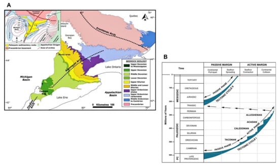 (A) Generalized Paleozoic bedrock geology of southern Ontario (modified from [,]); (B) Tectonic history of the Phanerozoic successions in southern Ontario (modified from []).